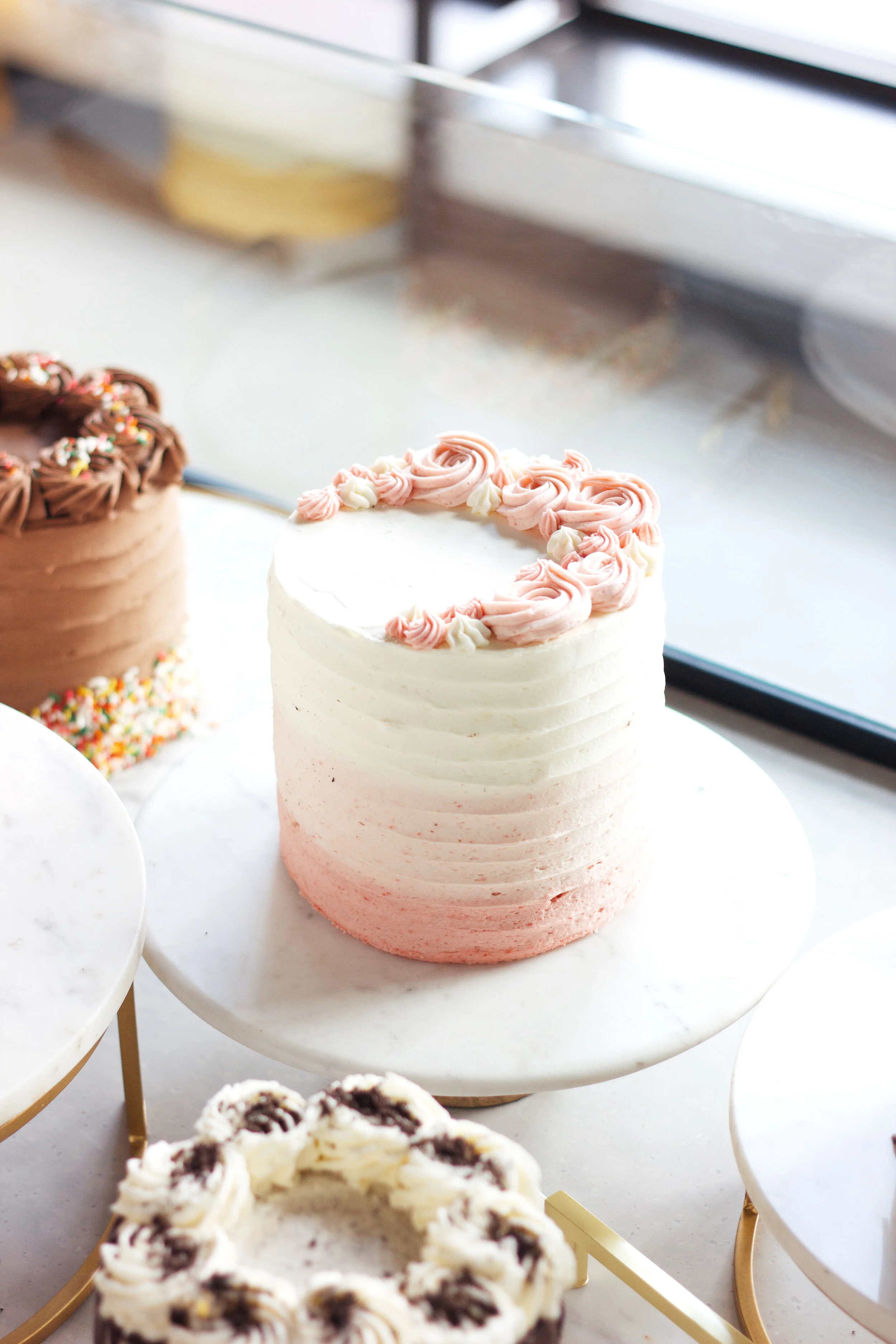 Cakes are decorated with a striped side and simple rosette border. Writing and/or rainbow sprinkles are optional. Custom orders require 48 hours.