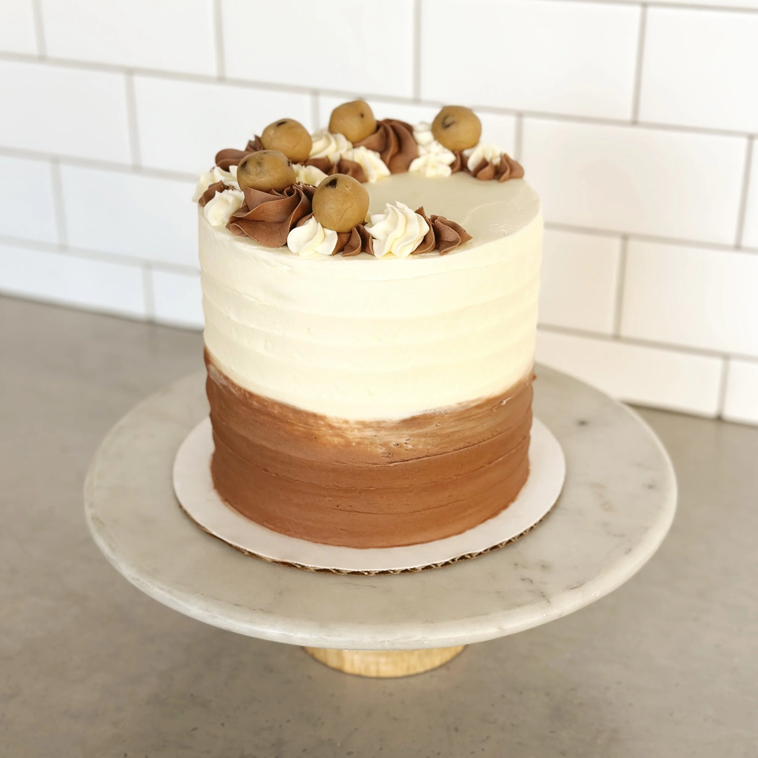 Layers of chocolate cake with vanilla buttercream and chocolate chip cookie dough.